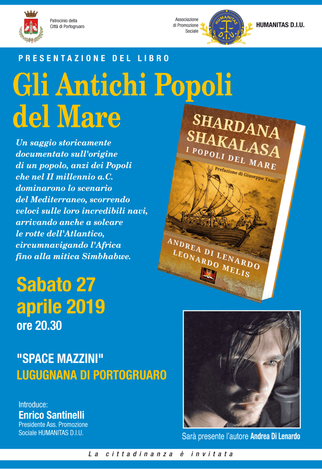 Sabato 27 aprile 2019 presso lo SPACE Mazzini di Lugugnana di Portogruaro lo scrittore Andrea Di Lenardo ha presentato il suo ultimo libro “Shardana Shakalasa – Gli antichi popoli del mare”. Una profonda visione storica delle migrazioni del Mediterraneo di circa 2 mila anni prima di Cristo. Presenti il Sindaco di Portogruaro e l’onorevole Ketty Fogliani, il Consigliere Regionale Fabiano Barbisan, alcuni Artiglieri del 5° Rgt. MLRS “Superga”, l’Aeronautica Militare e un folto pubblico di amici ed estimatori.